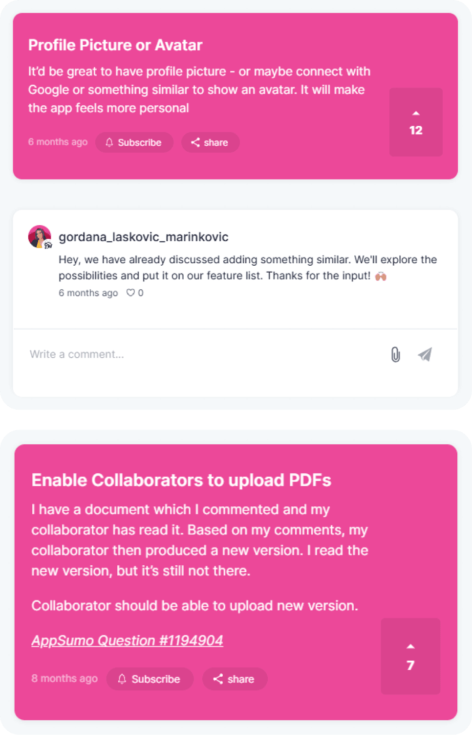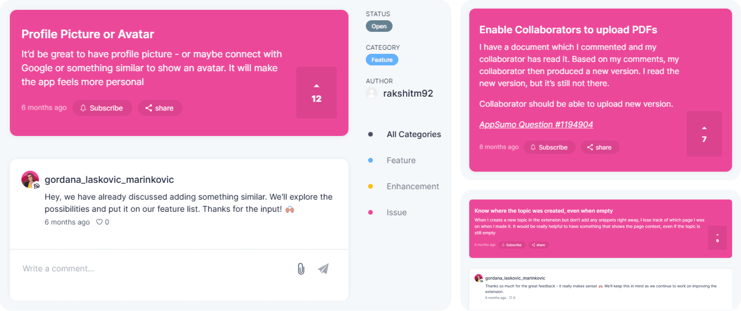 Via the Sleekplan app, I had access to suggestions from users about bugs, and features. Other community members could vote and leave comments. This way, I would know which features to prioritize.