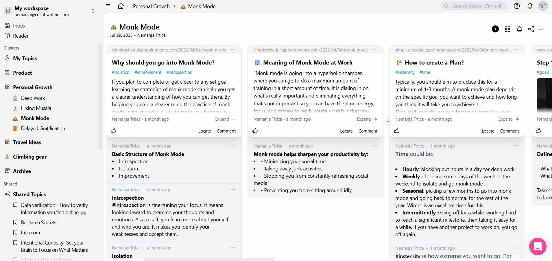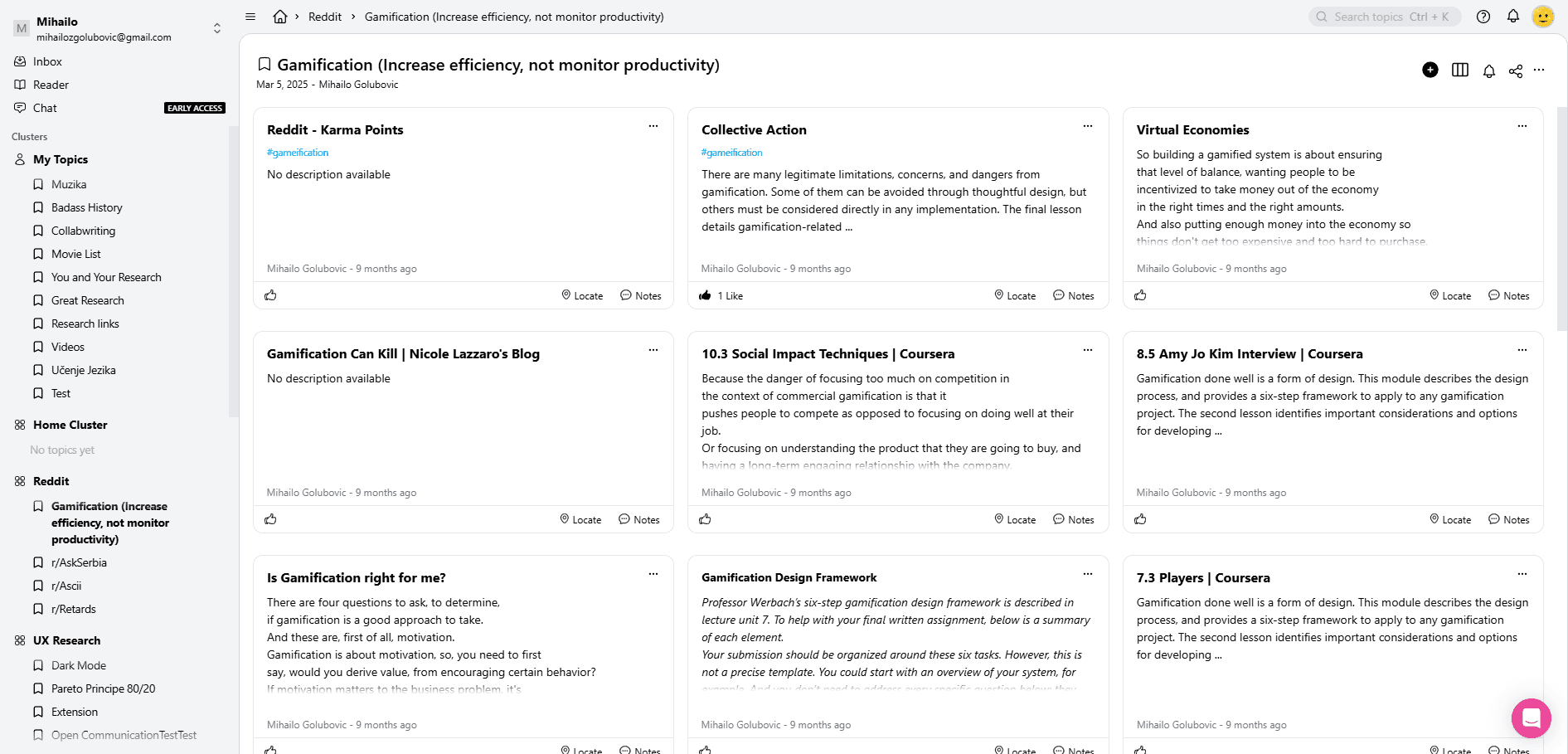 Collects insights from YouTube, blogs, LinkedIn. A million open tabs, messy research, no structure.