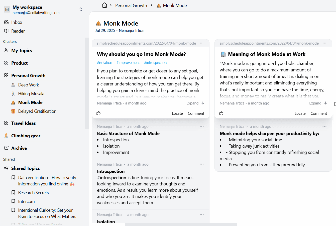 Collabwriting grew from a fragmented tool into a structured knowledge system. My work helped transform how users save, organize, and rediscover insights. This wasn’t just UI improvement. It was a product shift: from “save things” to “understand things”.